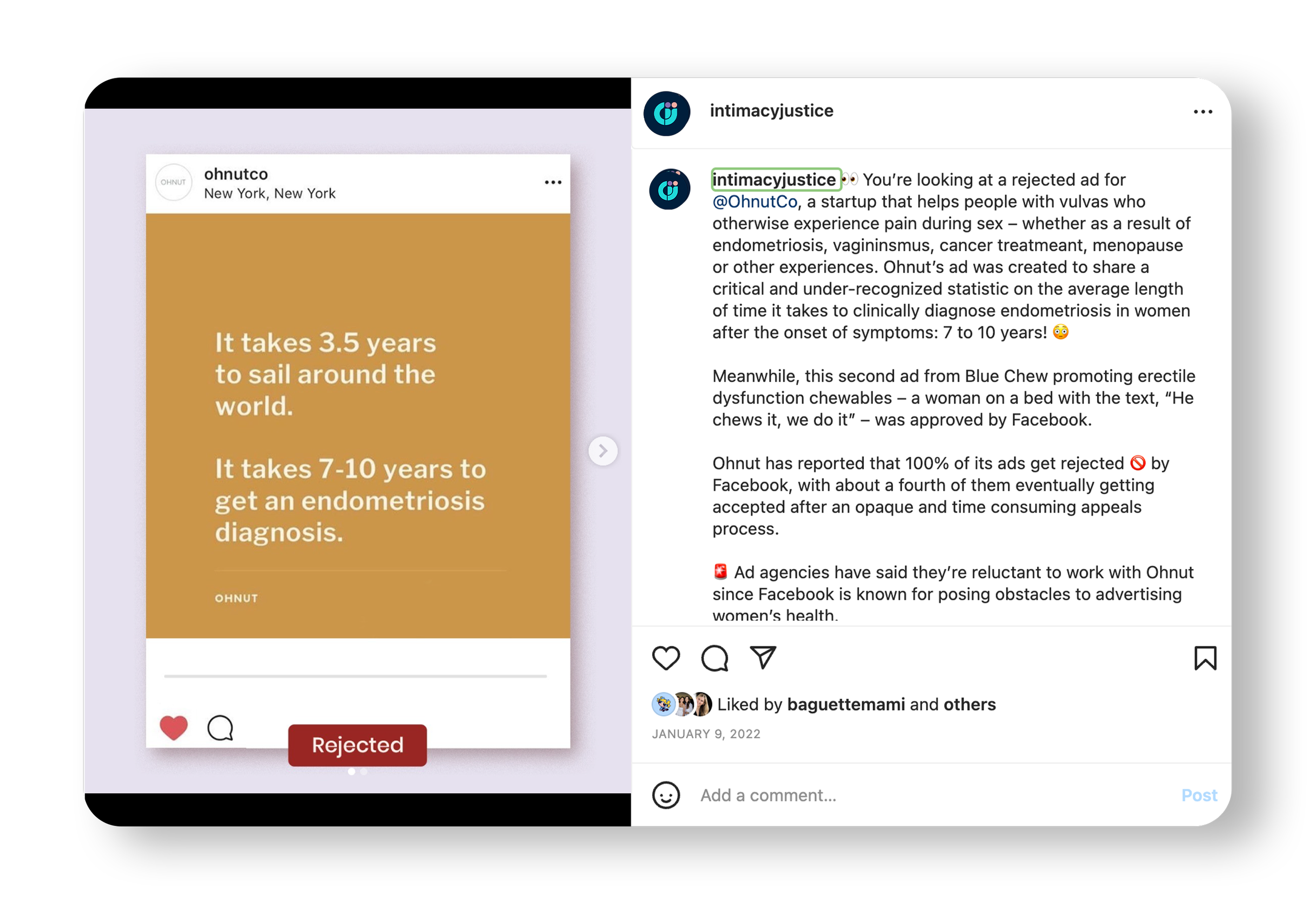 In January 2022, CIJ published a report describing Facebook's censorship of sexual health and wellness ads for women and people of diverse genders. Of the 60 health businesses studied that serve women's health, all (100%) had experienced Facebook rejecting an advertisement at some point.