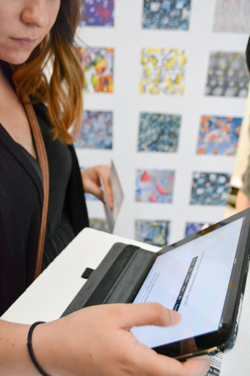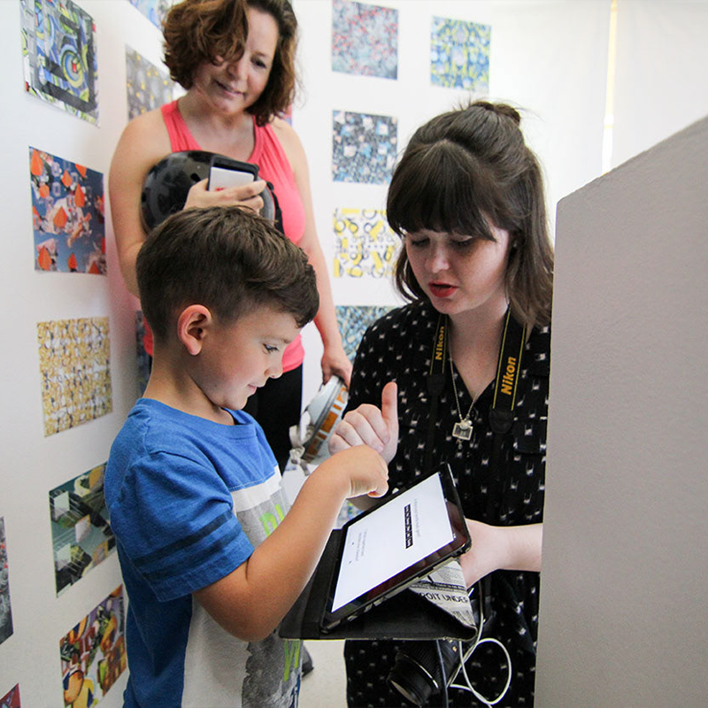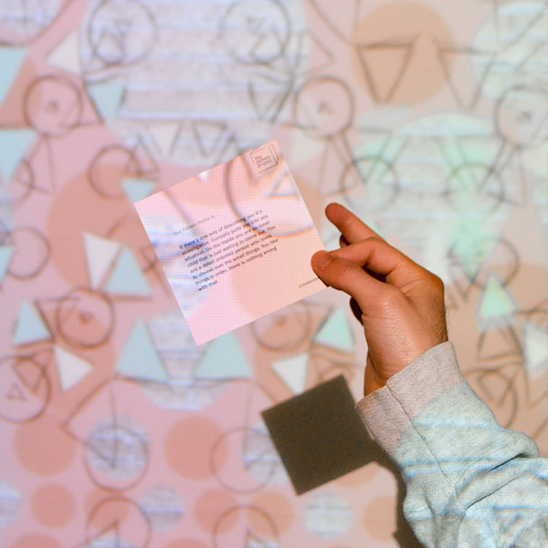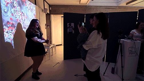 An algorithm generates a pattern based on your answers, using line, shape, color, form, and movement to represent your patterned profile. This personal pattern is projected large format onto the wall for you to interact with.